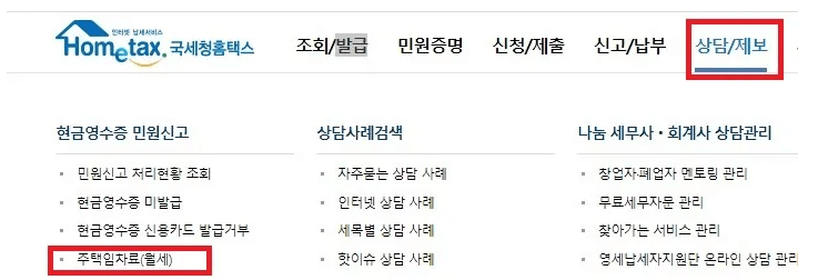 1) 국세청 홈택스 홈페이지에서 [상담/제보]를 선택하고 [현금 영수증 민원신고] 탭의 [주택 임차료(월세)] 를 선택한다.